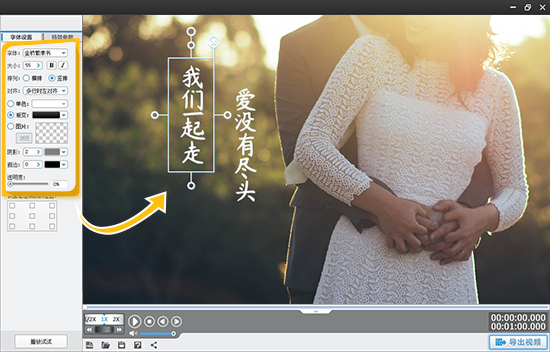 图2:选择特殊滚动类字幕将字幕样式调的更时尚在字幕特效列表右侧“字体设置”栏目对片尾字幕的字体、大小、颜色等进行个性化设置,并可在视频预览框中,通过拖曳字幕的方框调整字幕位置。
